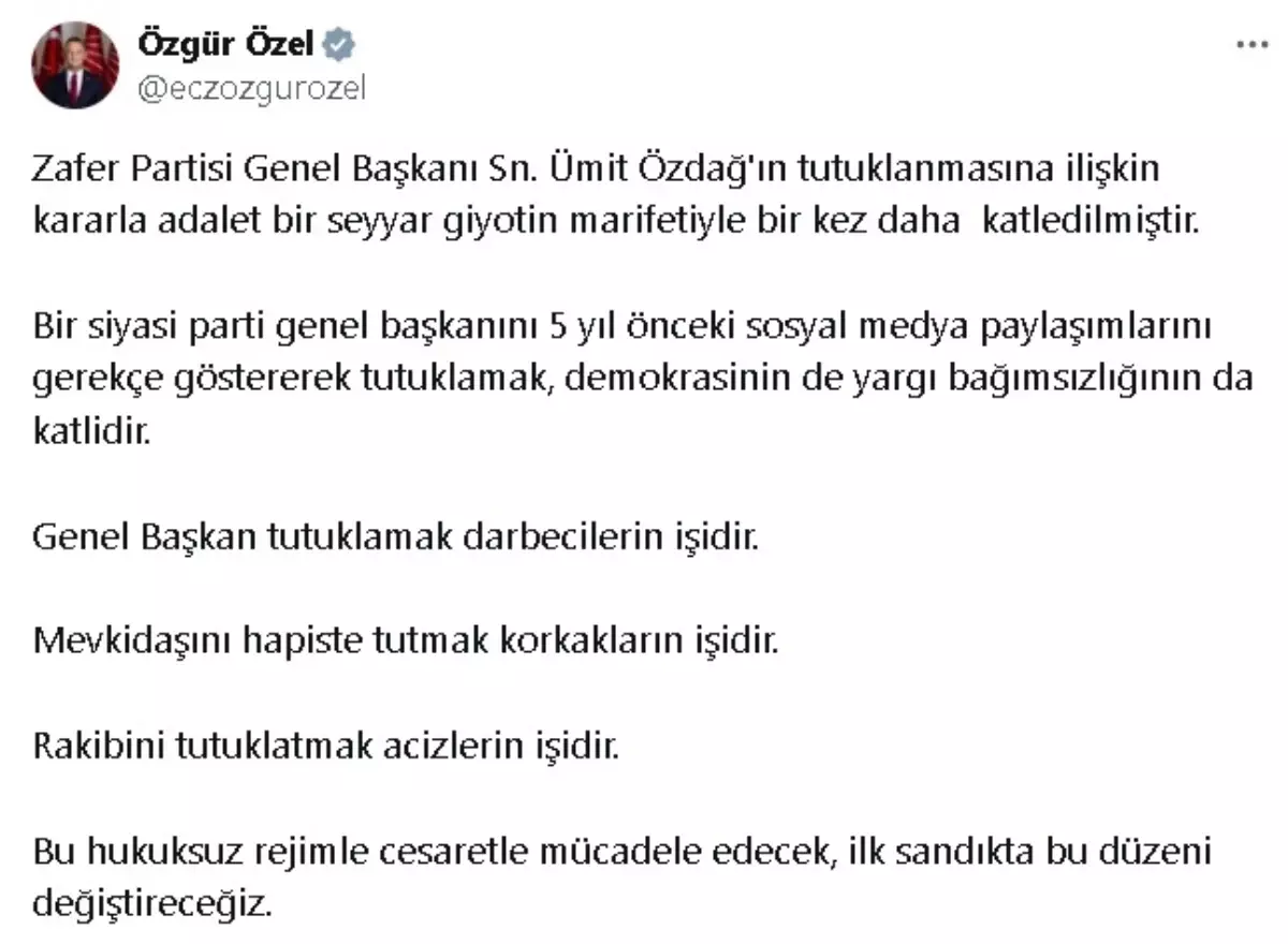 ÖZEL: ADALET BİR SEYYAR GİYOTİN MARİFETİYLE BİR KEZ DAHA KATLEDİLMİŞTİR CHP Genel Başkanı Özgür Özel, Zafer Partisi Genel Başkanı Ümit…